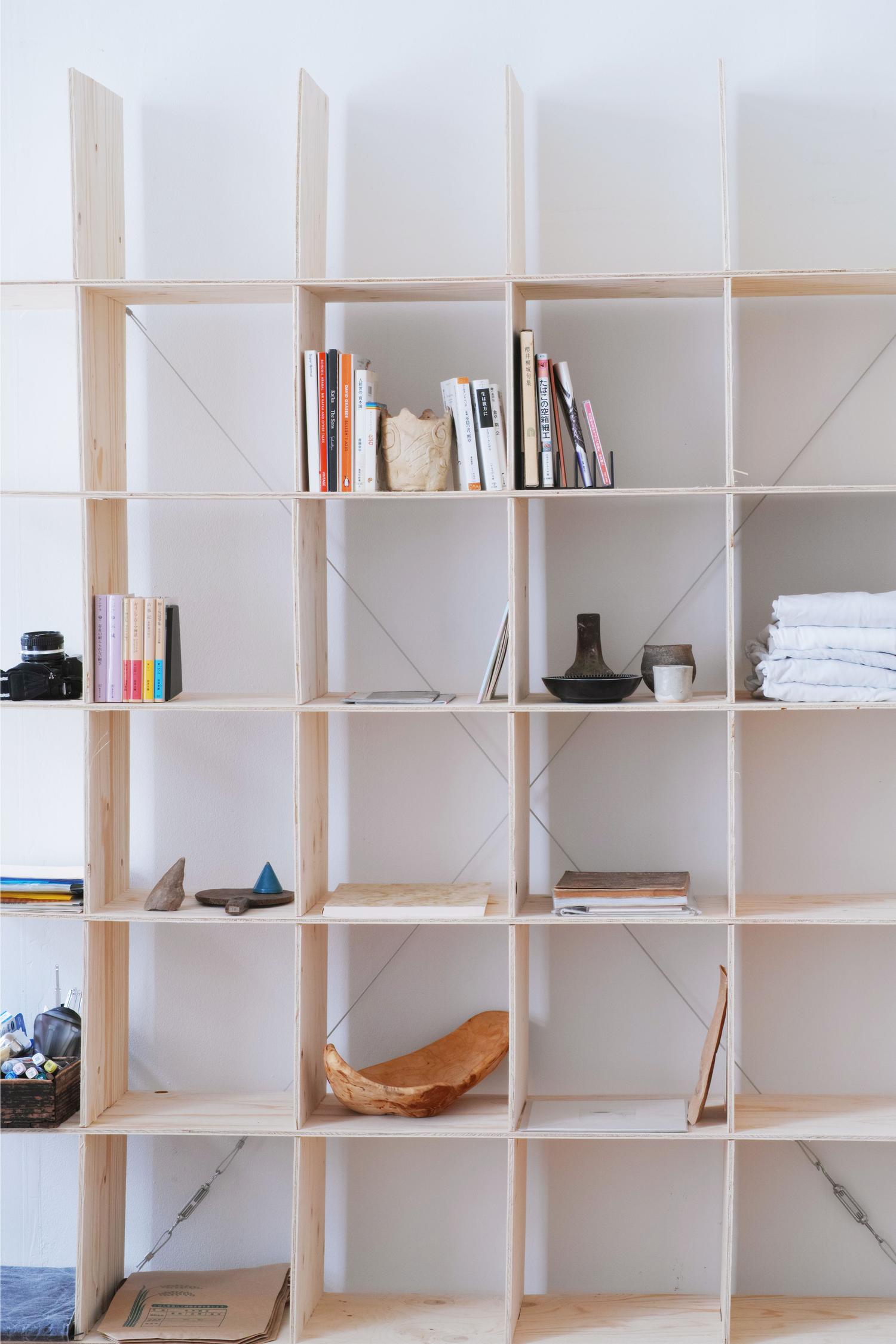 Interlocking structure that uses one type of component. The shelf is flatpack and quick to assemble. The diagonal wires behind the shelf acts as trusses, ensuring its stability.